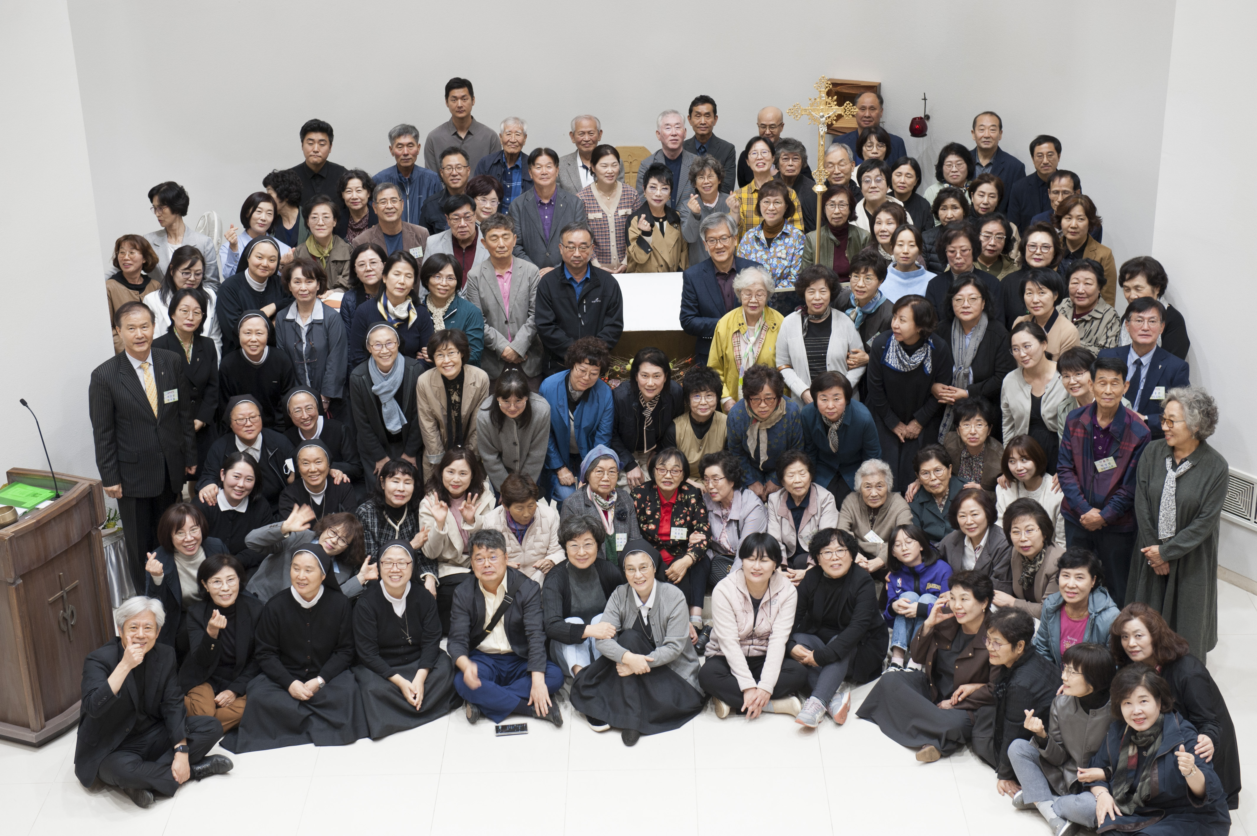 이 날 함께 했던 마리아니스트들입니다. 미사 중에 마리아회의 우상선 마태오 수사님의 칠순(七旬) 기념행사가 있어 시간이 많이 지체되었기에 인천 산곡동성당에서 빌려 타고 온 버스회사의 기사님이 예약한 시간보다 많이 지체되었다고 하도 불평을 하셔서 산곡동 신자들 80여명은 영성체 후 우 수사님이 칠순 잔치 중에 먼저 퇴장하셨기에 산곡동 성당 신자들을 제외하고 남은 마리아니스트들만 남아서 미사 후에 기념 촬영을 했습니다.
